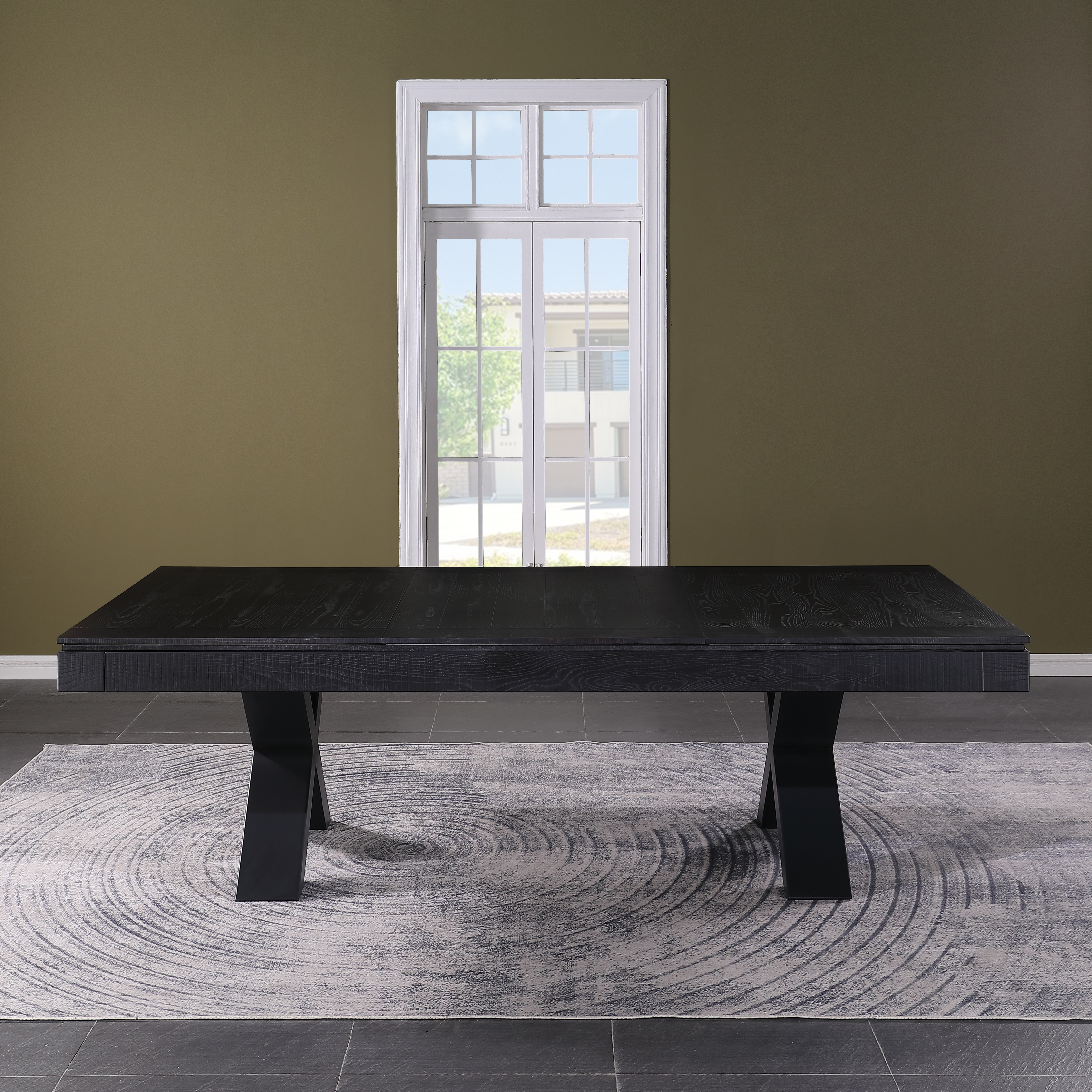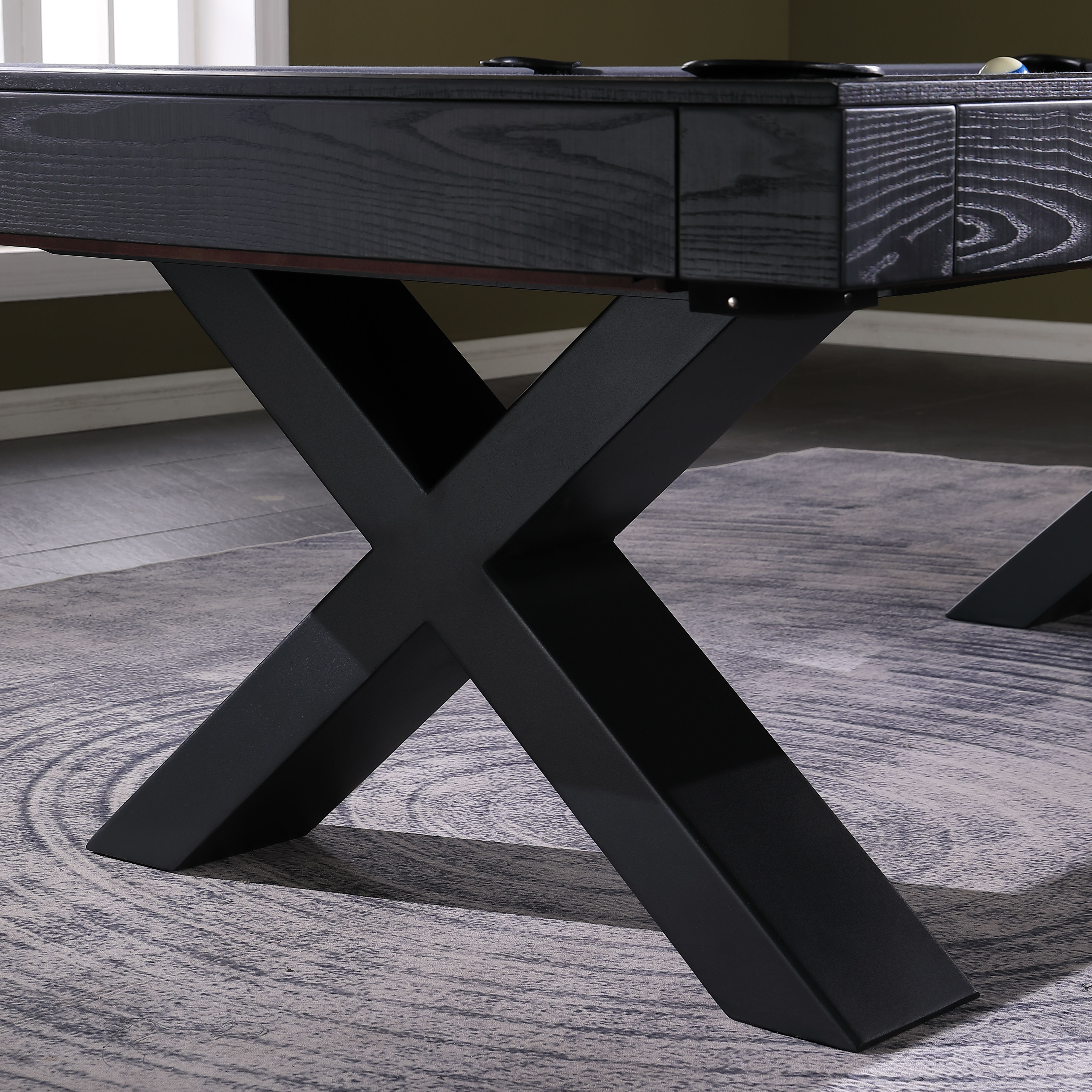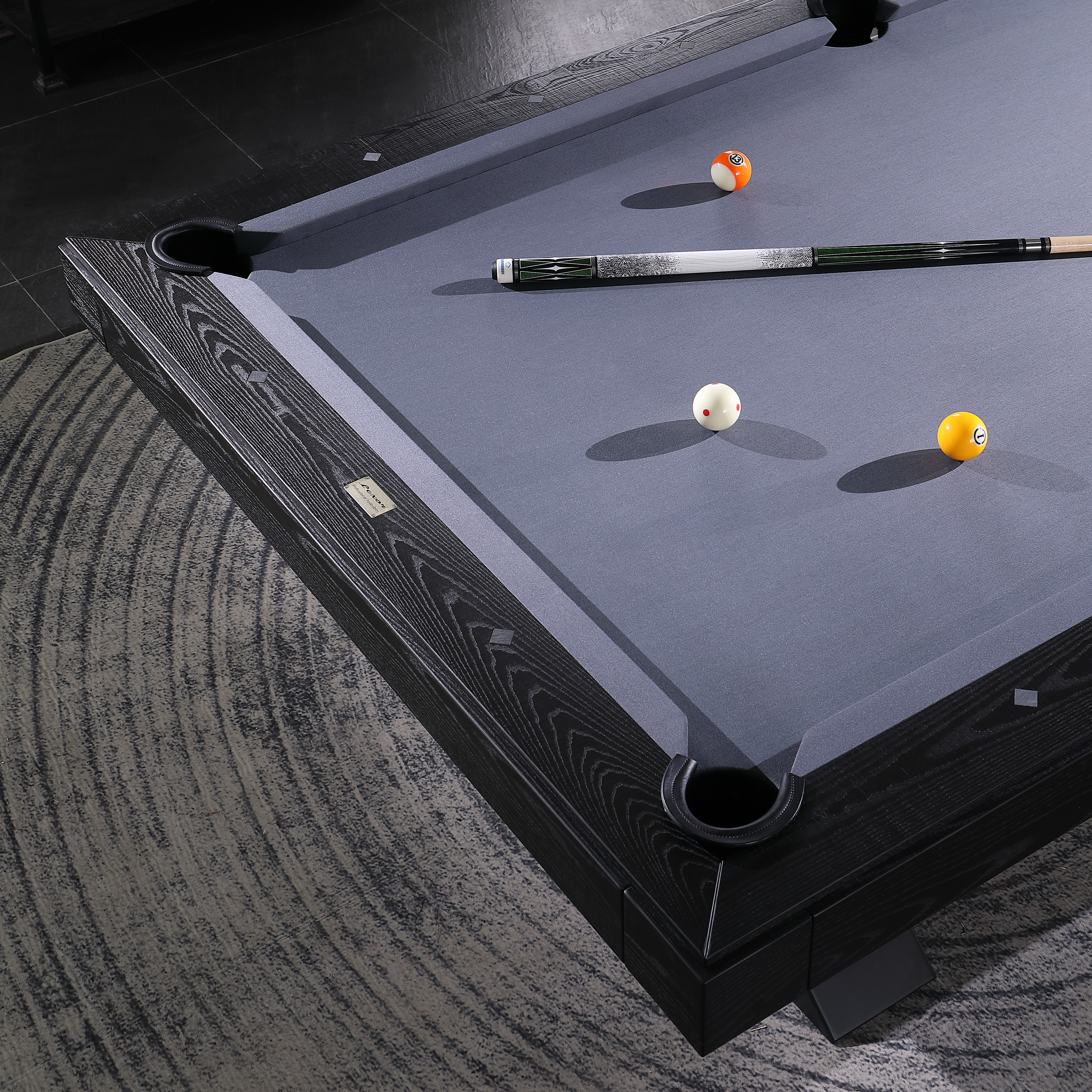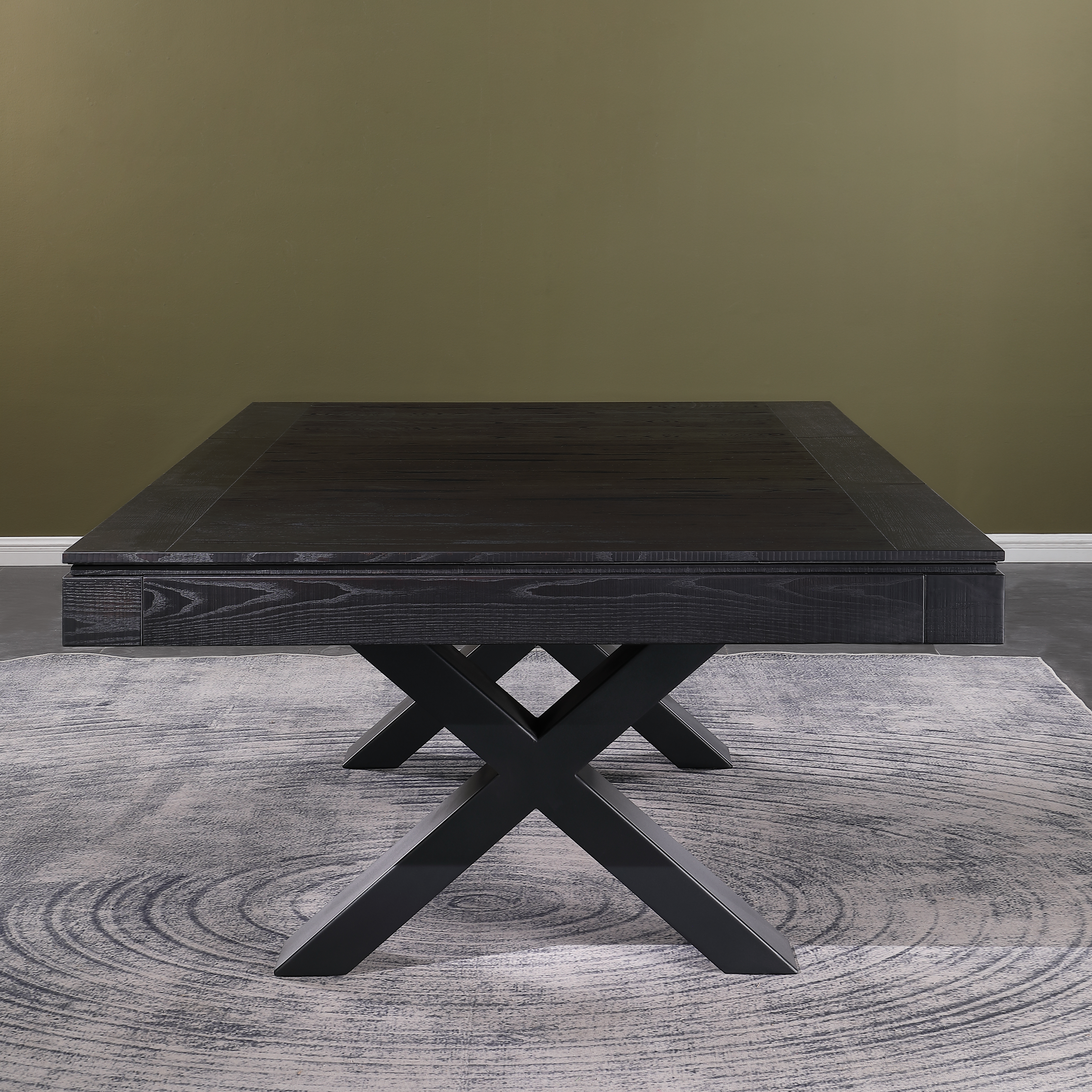 Prachtig strak design en ondanks zijn robuustere voorkomen met een ruimtelijke vormgeving en uitstraling. Deze slanke buik is mogelijk gemaakt door een zwaar deelbaar frame met stevige stalen poten. Waarbij de body is uitgevoerd in stevig geborsteld hardhout met een zeer duidelijk voelbare houtstructuur en stijlvolle ingelegde leistenen Diamonds in een zwart eiken kleur. Wat samen met de zwart metalen poten het totaal een trendy maar stoere en ruimtelijke uitstraling geven. De handzame 3-delige afdekbladen hebben een mooie planken structuur wat het geheel compleet maakt en u deze prachtige pooltafel in een handomdraai omtovert tot een exclusieve dinner/bureau. Uniek zijn de in het frame verzonken banden waarmee deze prachtige pooltafel met de bladen erop de pooltafel volledig verbergt en een enkel ware luxe eettafel toont.