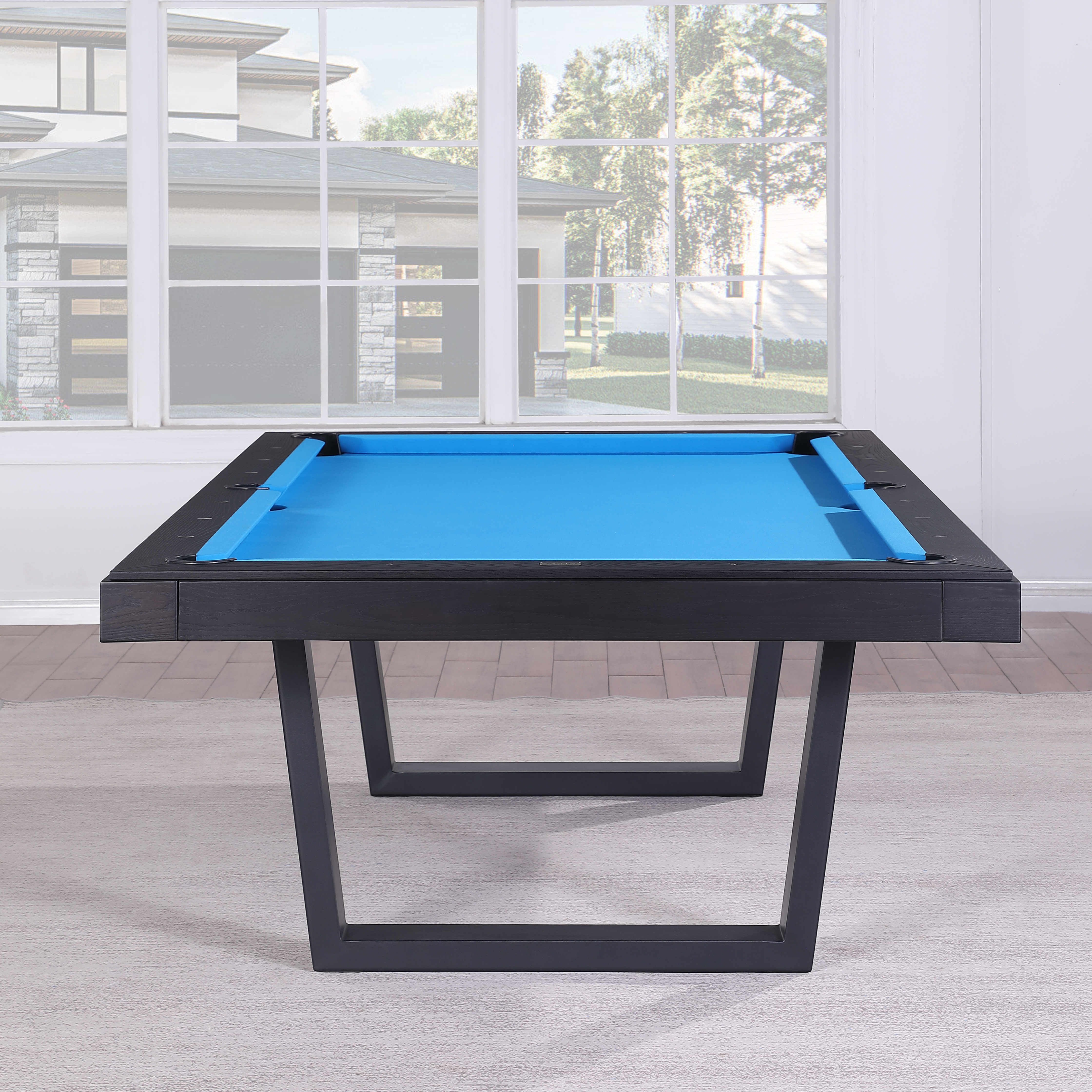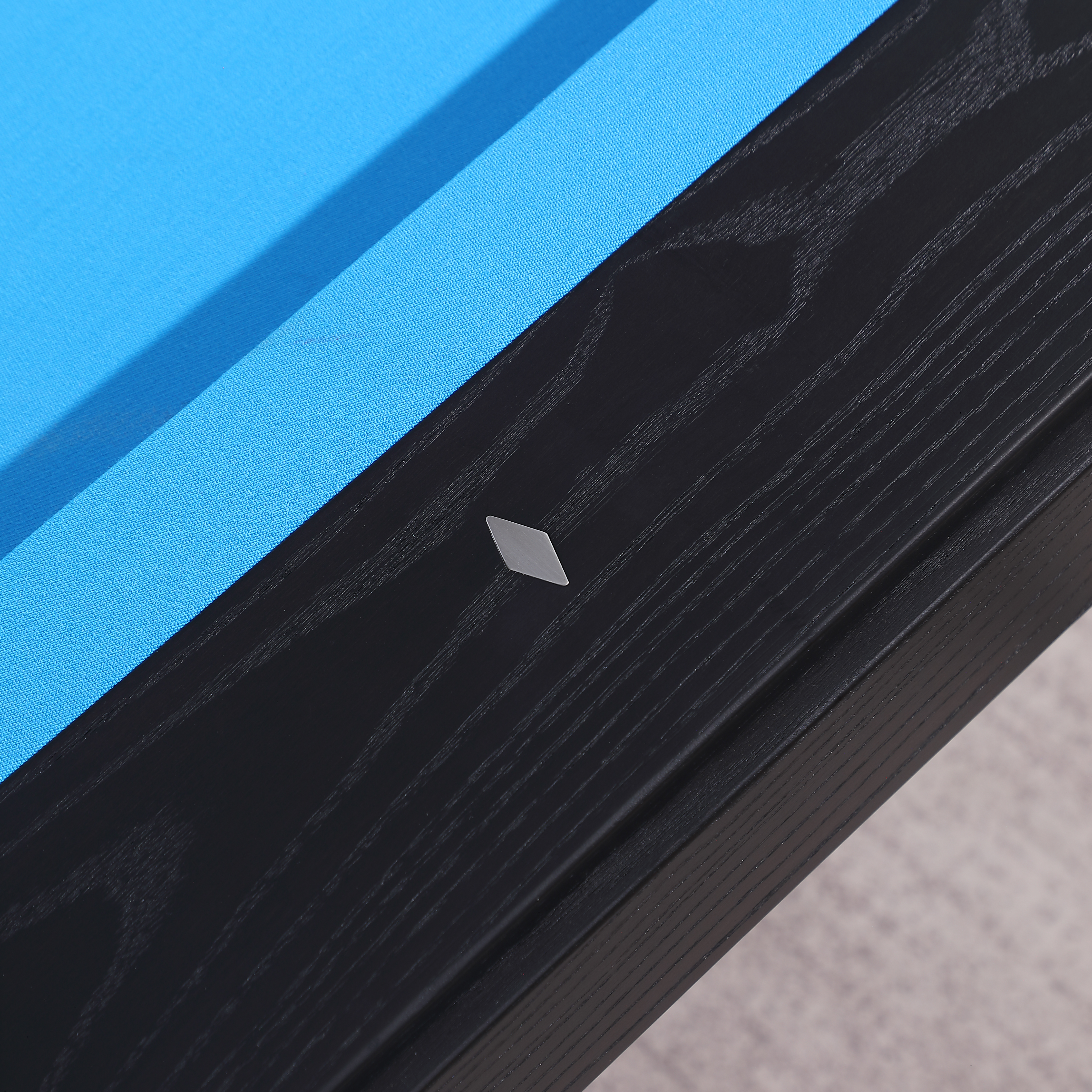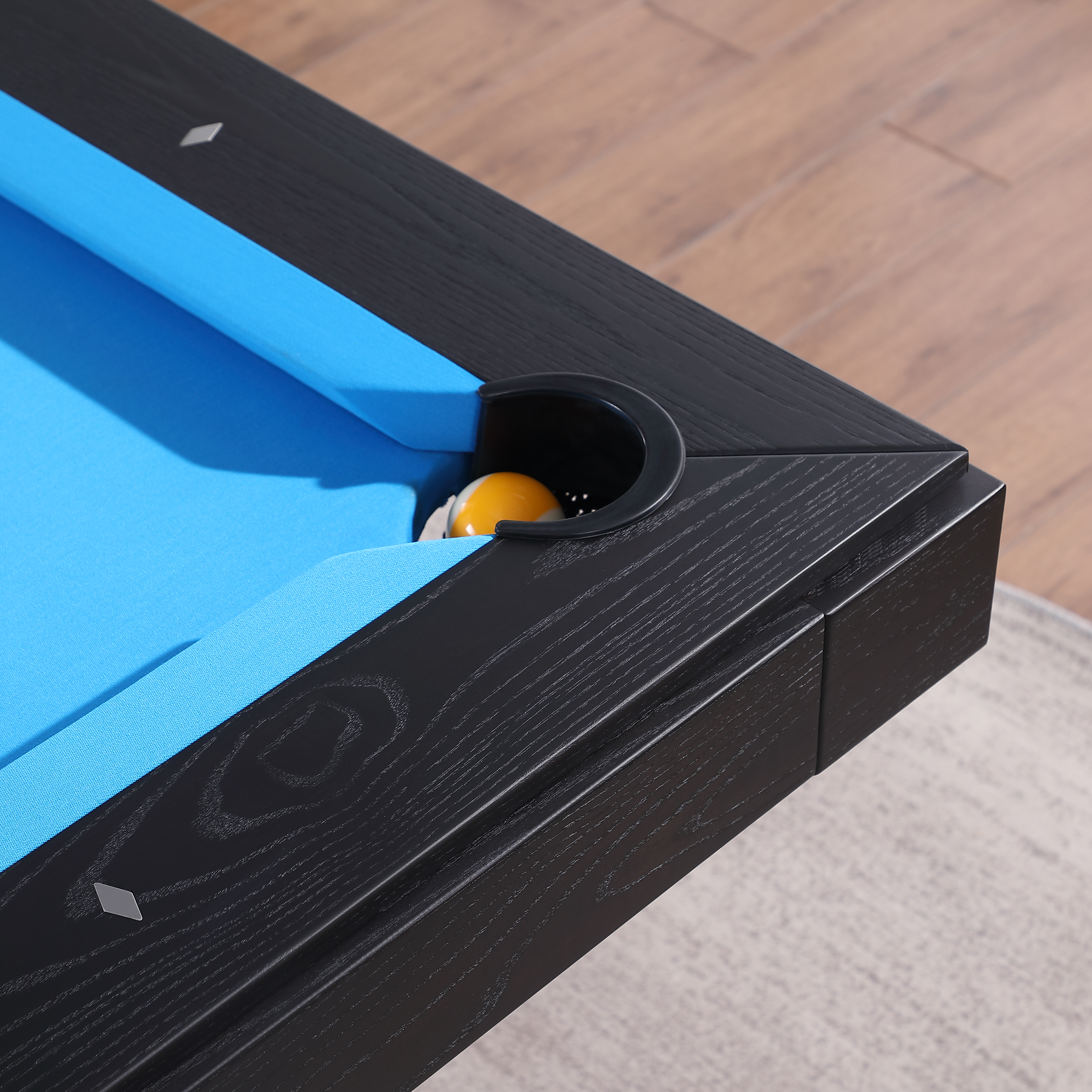 Prachtig strak design en ondanks zijn robuustere voorkomen met een ruimtelijke vormgeving en uitstraling. Deze slanke buik is mogelijk gemaakt door een zwaar deelbaar frame met stevige stalen poten. Waarbij de body is uitgevoerd in stevig geborsteld hardhout met een zeer duidelijk voelbare houtstructuur en stijlvolle ingelegde leistenen Diamonds in een zwart eiken kleur. Wat samen met de zwart metalen poten het totaal een trendy maar stoere en ruimtelijke uitstraling geven. De handzame 3-delige afdekbladen hebben een mooie planken structuur wat het geheel compleet maakt en u deze prachtige pooltafel in een handomdraai omtovert tot een exclusieve dinner/bureau. Uniek zijn de in het frame verzonken banden waarmee deze prachtige pooltafel met de bladen erop de pooltafel volledig verbergt en een enkel ware luxe eettafel toont.