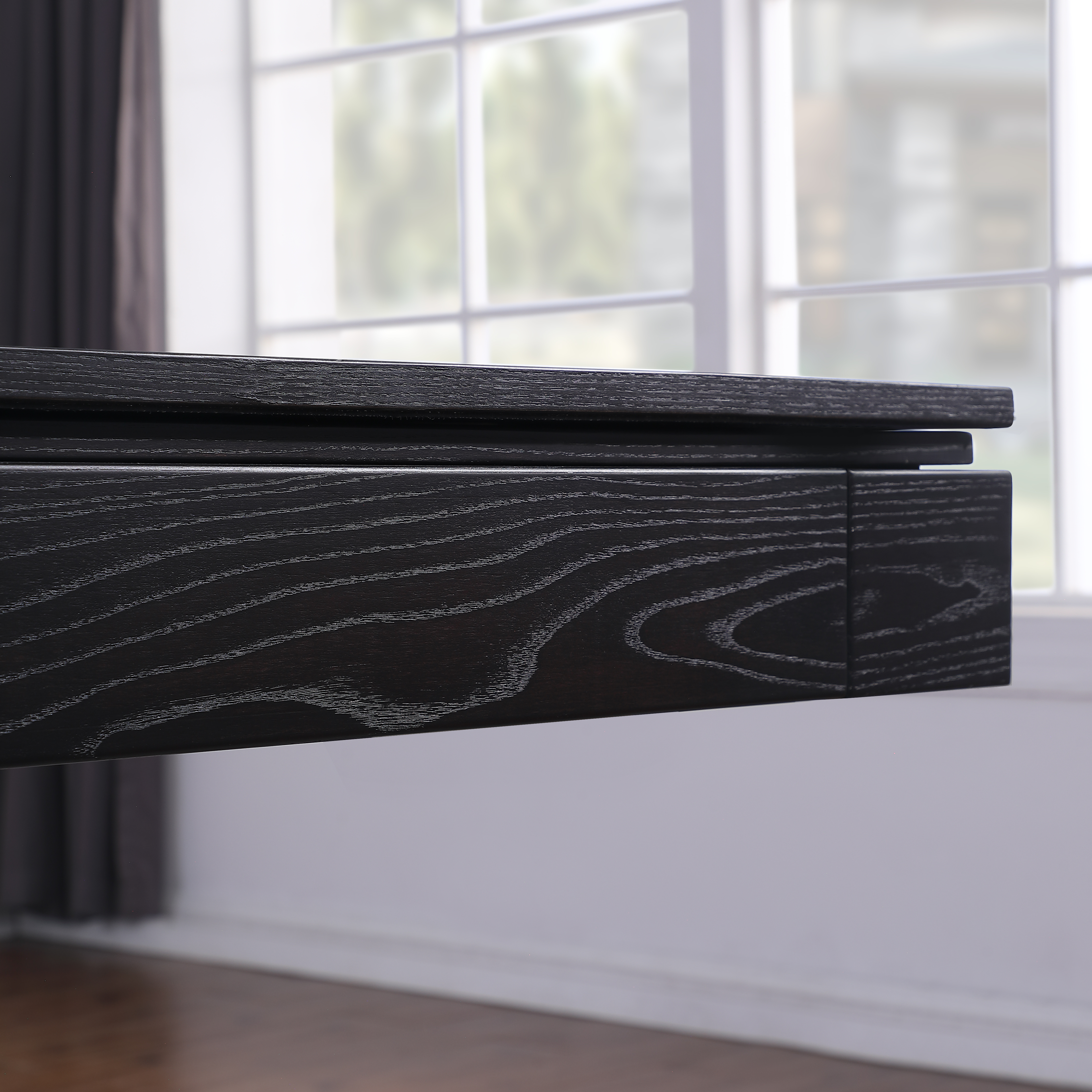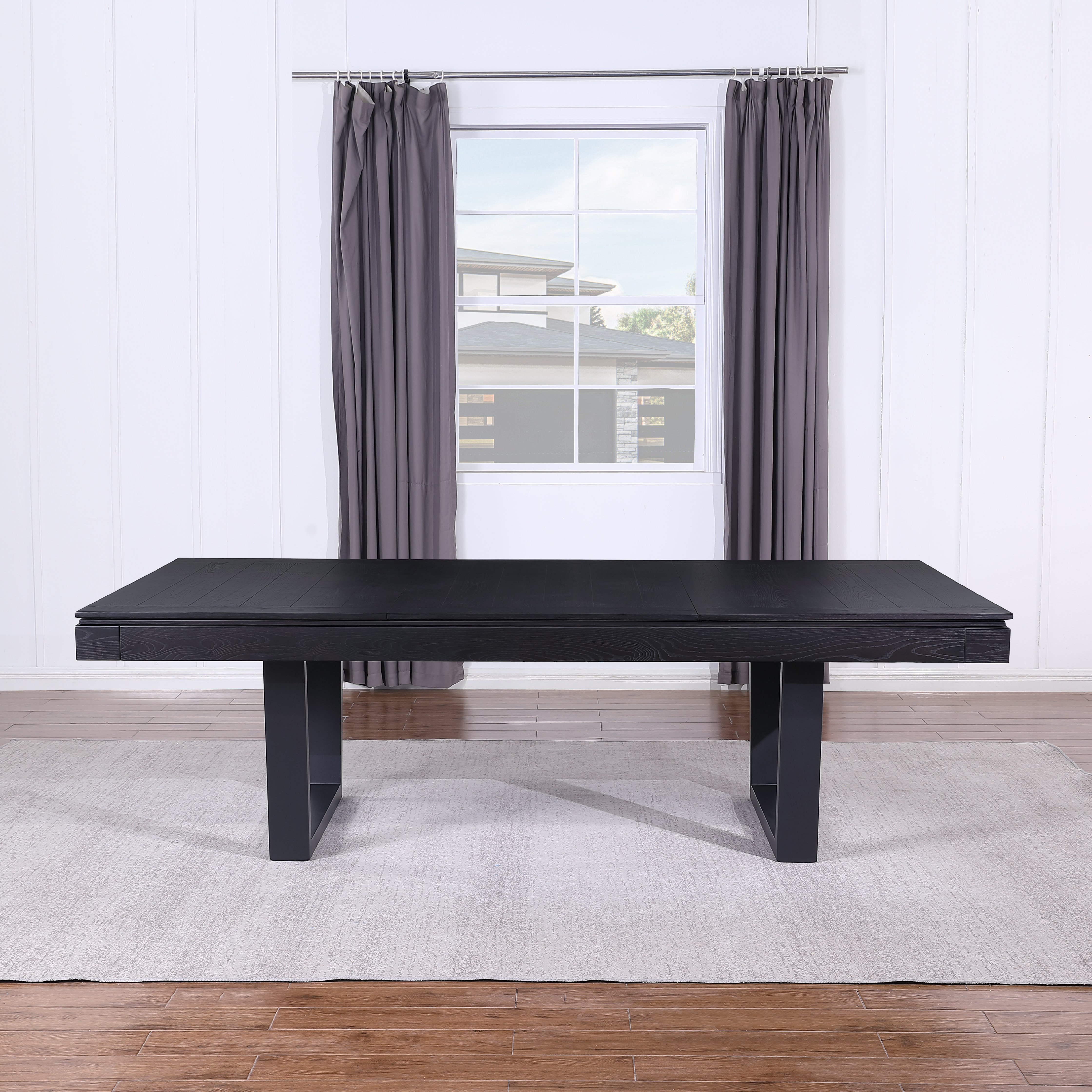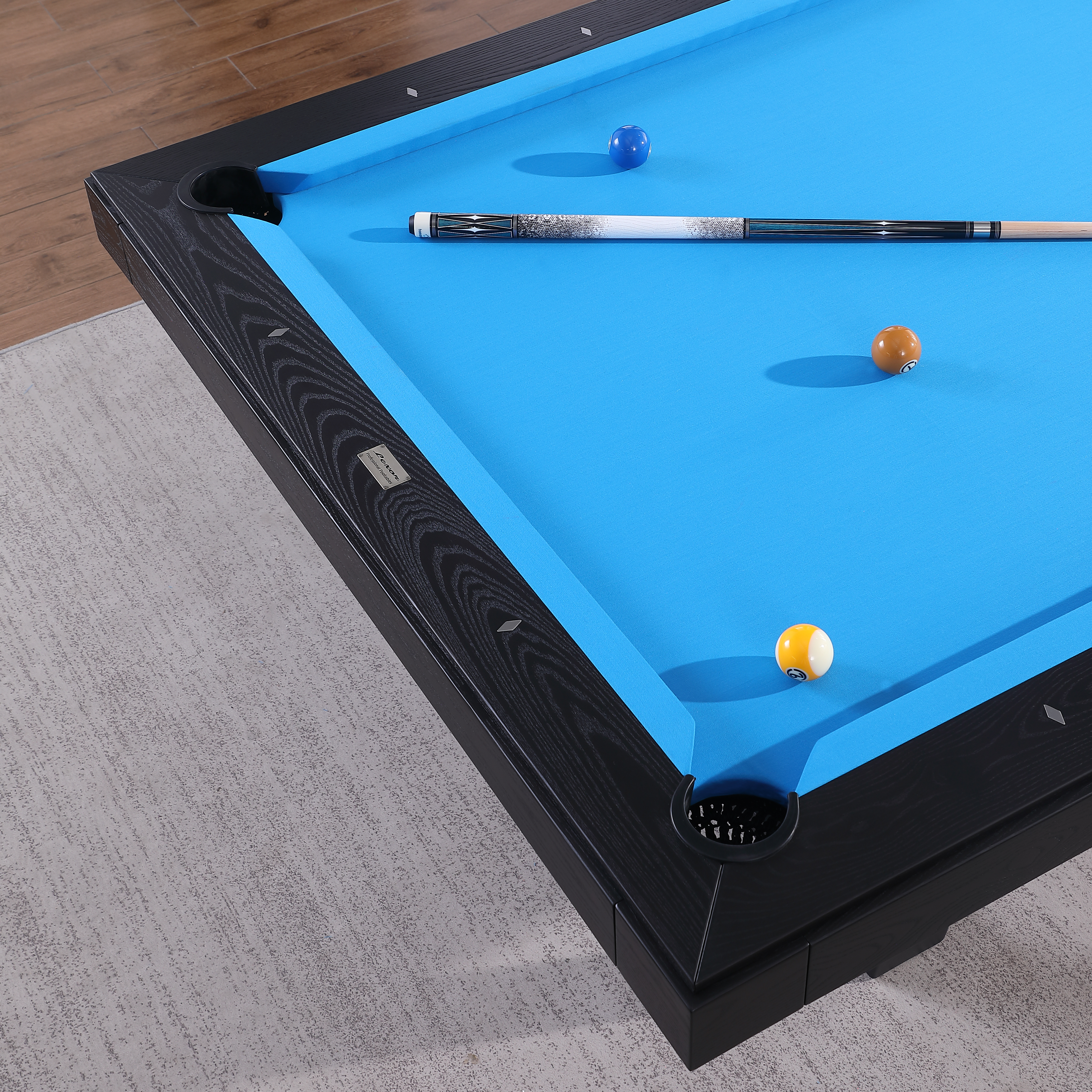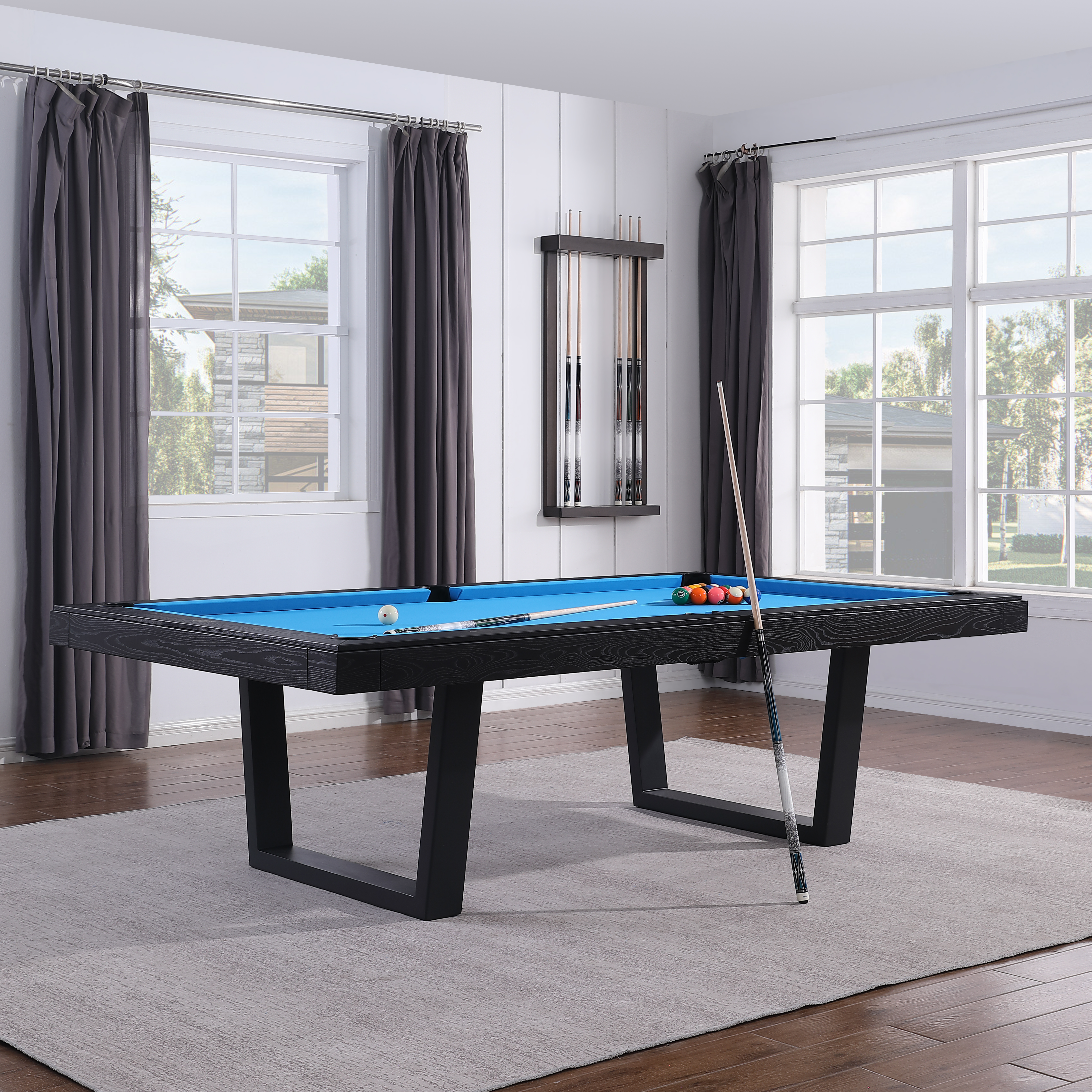 Prachtig strak design en ondanks zijn robuustere voorkomen met een ruimtelijke vormgeving en uitstraling. Deze slanke buik is mogelijk gemaakt door een zwaar deelbaar frame met stevige stalen poten. Waarbij de body is uitgevoerd in stevig geborsteld hardhout met een zeer duidelijk voelbare houtstructuur en stijlvolle ingelegde leistenen Diamonds in een zwart eiken kleur. Wat samen met de zwart metalen poten het totaal een trendy maar stoere en ruimtelijke uitstraling geven. De handzame 3-delige afdekbladen hebben een mooie planken structuur wat het geheel compleet maakt en u deze prachtige pooltafel in een handomdraai omtovert tot een exclusieve dinner/bureau. Uniek zijn de in het frame verzonken banden waarmee deze prachtige pooltafel met de bladen erop de pooltafel volledig verbergt en een enkel ware luxe eettafel toont.